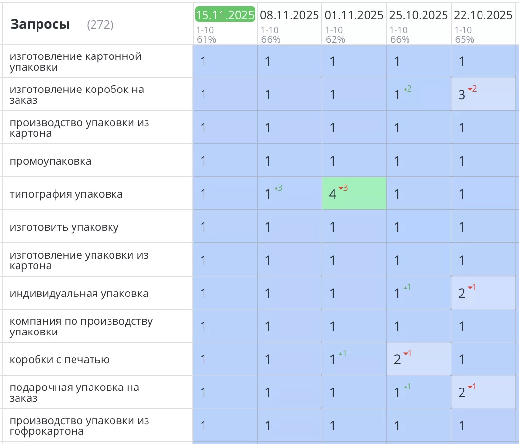 Было выполнено продвижение сайта упаковки из картона в Санкт-Петербурге для компании «Петербургская картонно-бумажная компания» (ПТК БИК). Системная работа позволила вывести сайт https://ptkbik.ru на лидирующие позиции в поиске Яндекс по основным высокочастотным и коммерческим запросам в Санкт-Петербурге и ЛО. Значительно вырос трафик из органического поиска, а главное — увеличилось количество целевых обращений и заказов от новых клиентов.