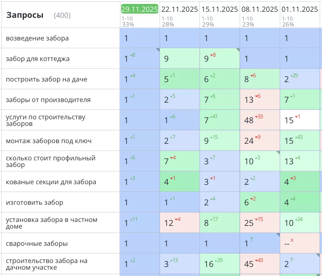 Компания «Палитра Заборов» обратилась к нам с запросом на продвижение сайта. Несмотря на качественные услуги по установке заборов в Москве, сайт не привлекал достаточного количества клиентов. В ходе аудита мы выявили ряд технических и SEO-ошибок, которые сдерживали его рост в поисковых системах. Все проблемы были устранены и сайт уверенно вышел по всем основным запросам в ТОП1 Яндекс.