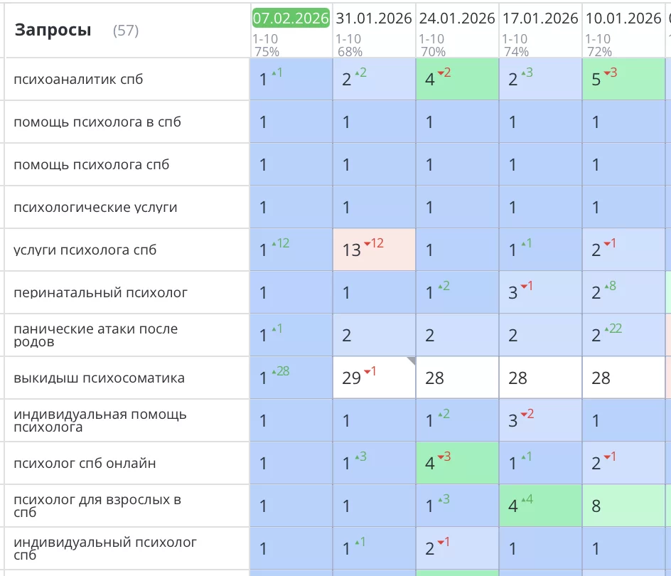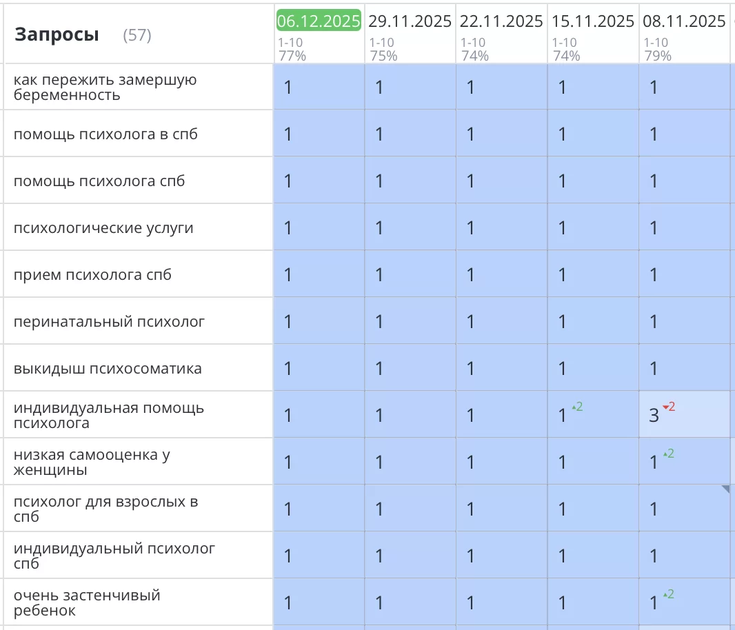 Было выполнено продвижение сайта психолога в Санкт-Петербурге Людмилы Алтыевой — psycholog-v-centre.ru. Вместе с созданием сайта с нуля процесс продвижения занял 4 месяца.