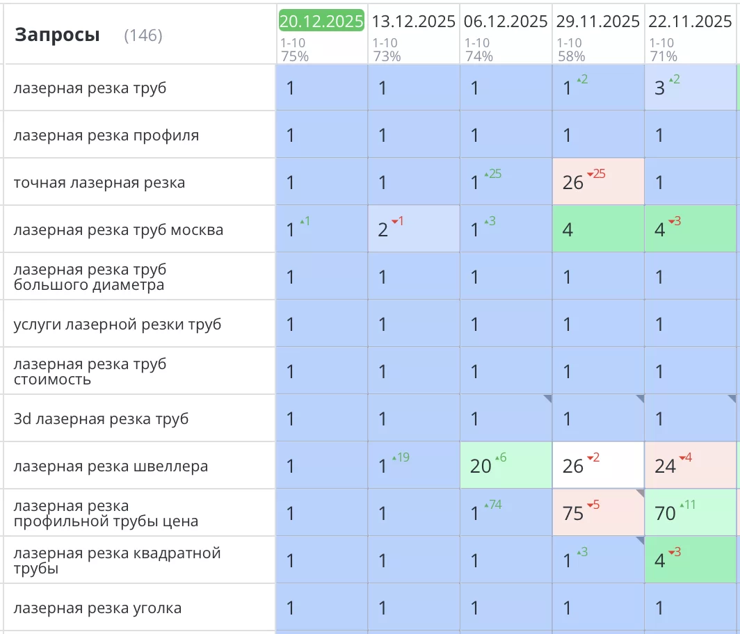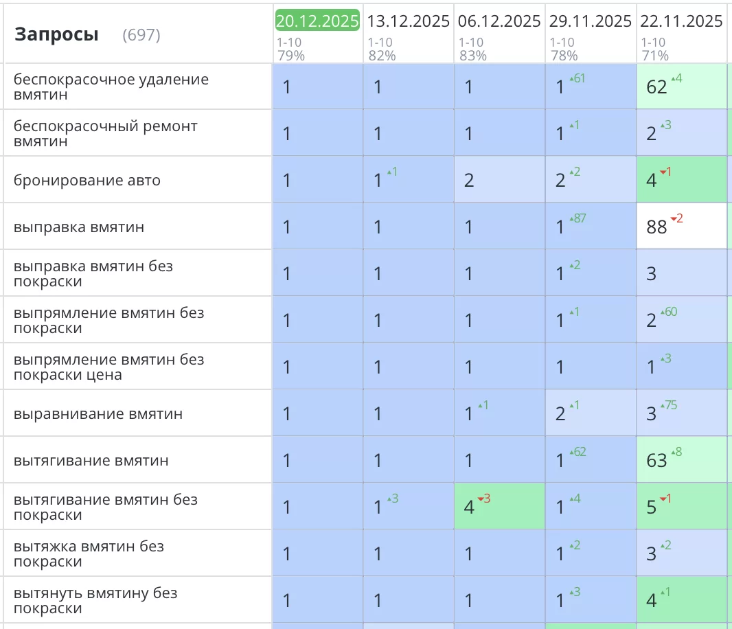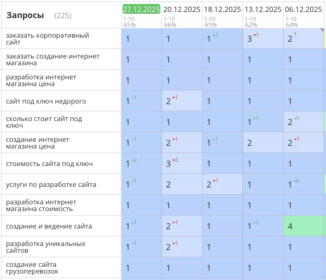 Первым этапом продвижения сайта стало проведение детального SEO аудита. Мы проанализировали текущие позиции сайта в выдаче, выявили слабые стороны и определили ключевые факторы, которые мешали сайту выйти в ТОП3. Также был проведён глубокий анализ конкурентов, находящихся на высоких позициях, чтобы понять их стратегии и методы. В итоге работ, все основные запросы уверенно вышли в ТОП1 Яндекс и зафиксировались там!