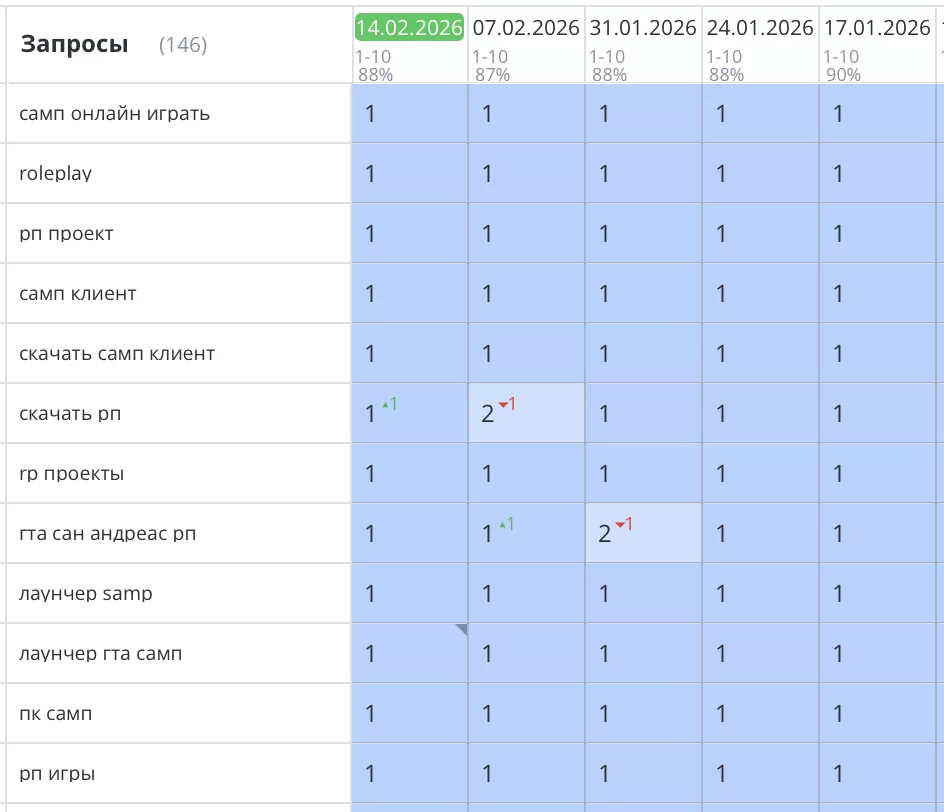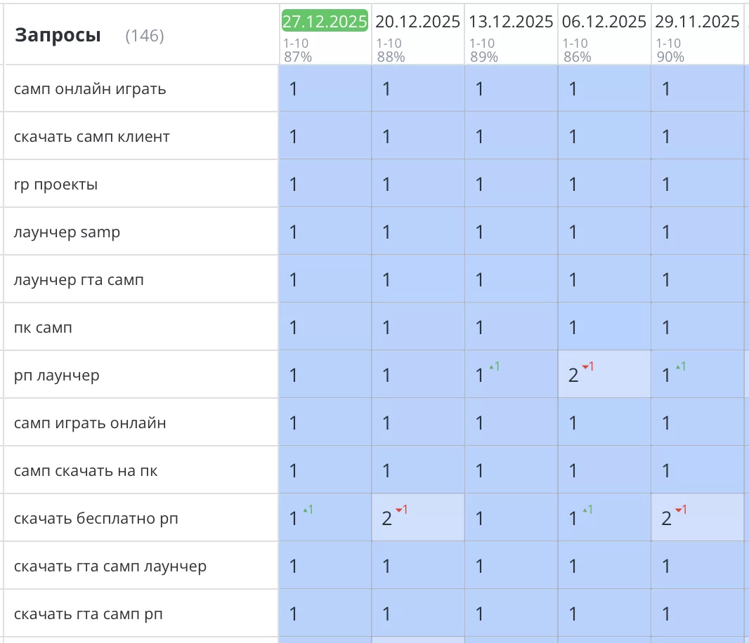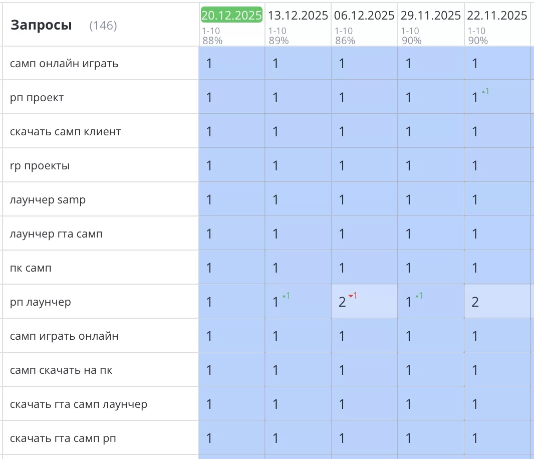 Было выполнено продвижение сайта онлайн игры GTA SAMP. Выявлены и устранены все основные технические проблемы, сдерживающие SEO продвижение. После всех доработок все основные позиции сайта уверенно вышли в ТОП1 Яндекс и зафиксировались там. Целевой трафик вырос более 70%. Заявки на вступление в игру выросли.