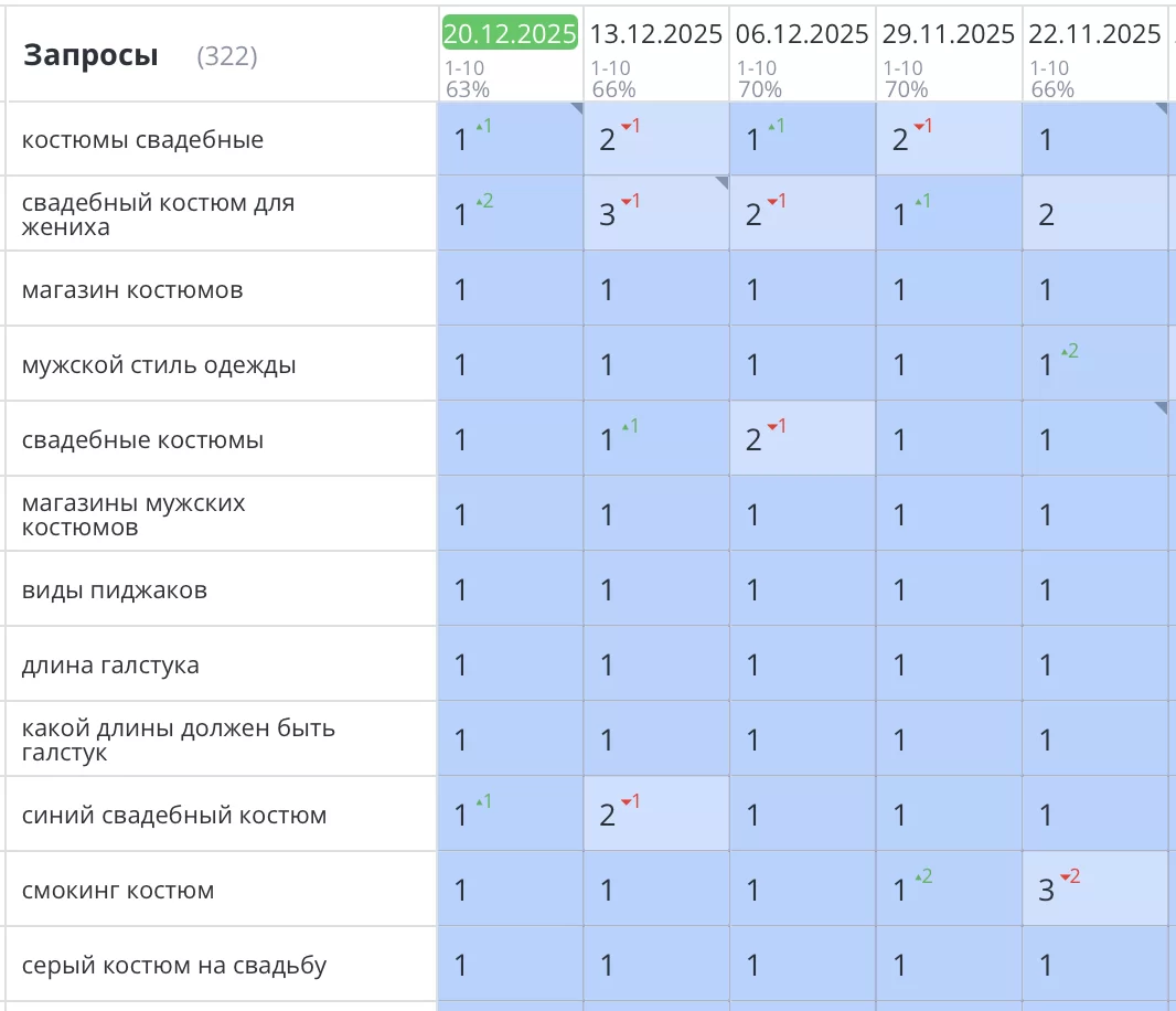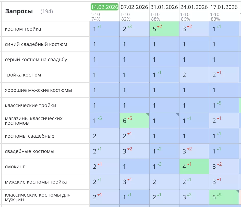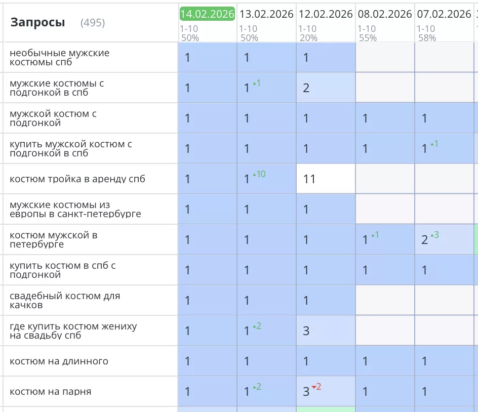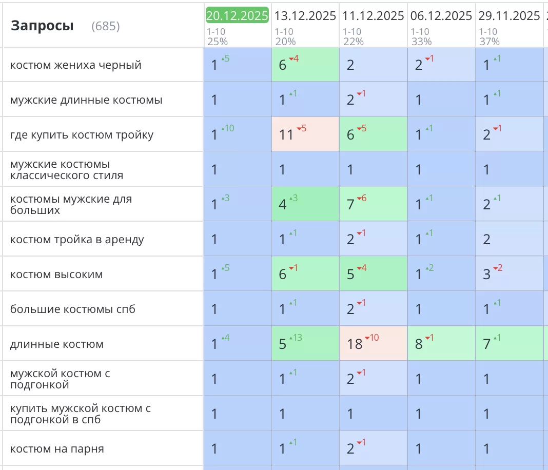 Стабильный рост посещаемости и улучшение позиций интернет-магазина мужских костюмов в Санкт-Петербурге.