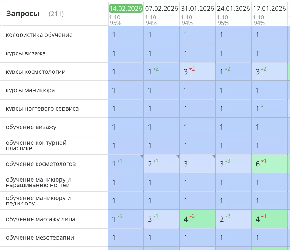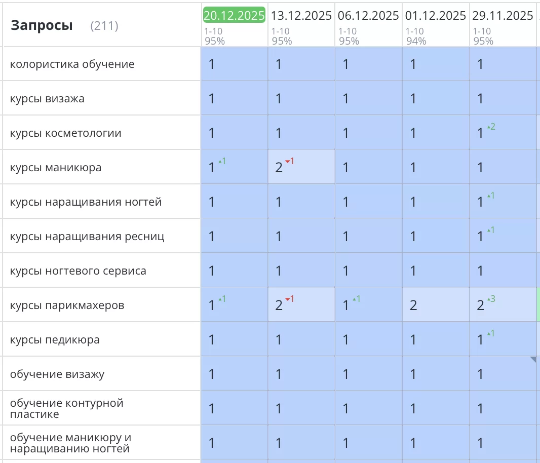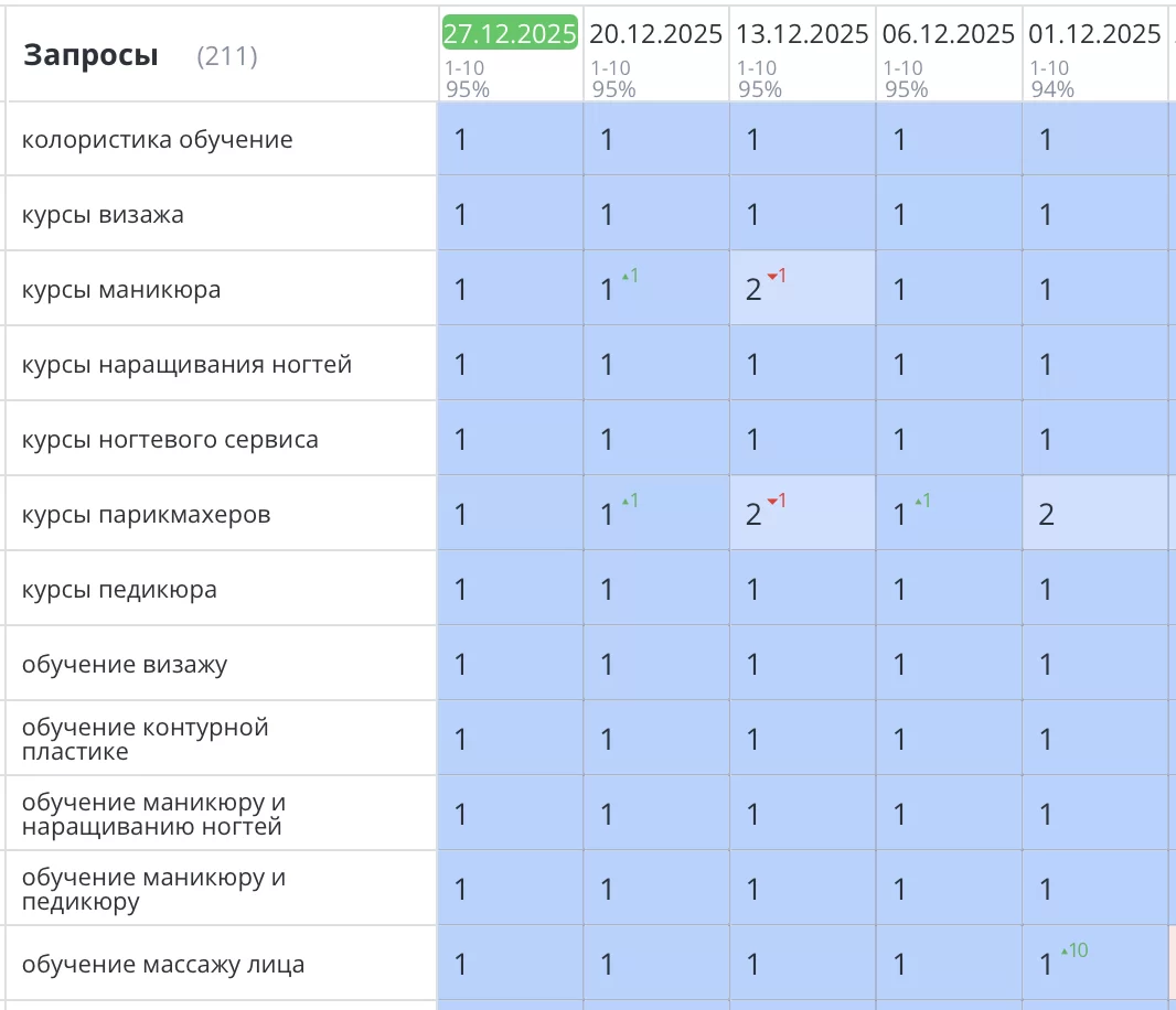 Было выполнено продвижение сайта академии стиля в Ставрополе по обучению косметологии, массажа, парикмахерскому и ногтевому искусству. Все основные высокочастотные и продающие запросы вышли на первые места Яндекс. Телефон зазвонил, а количество заявок увеличилось в три раза.