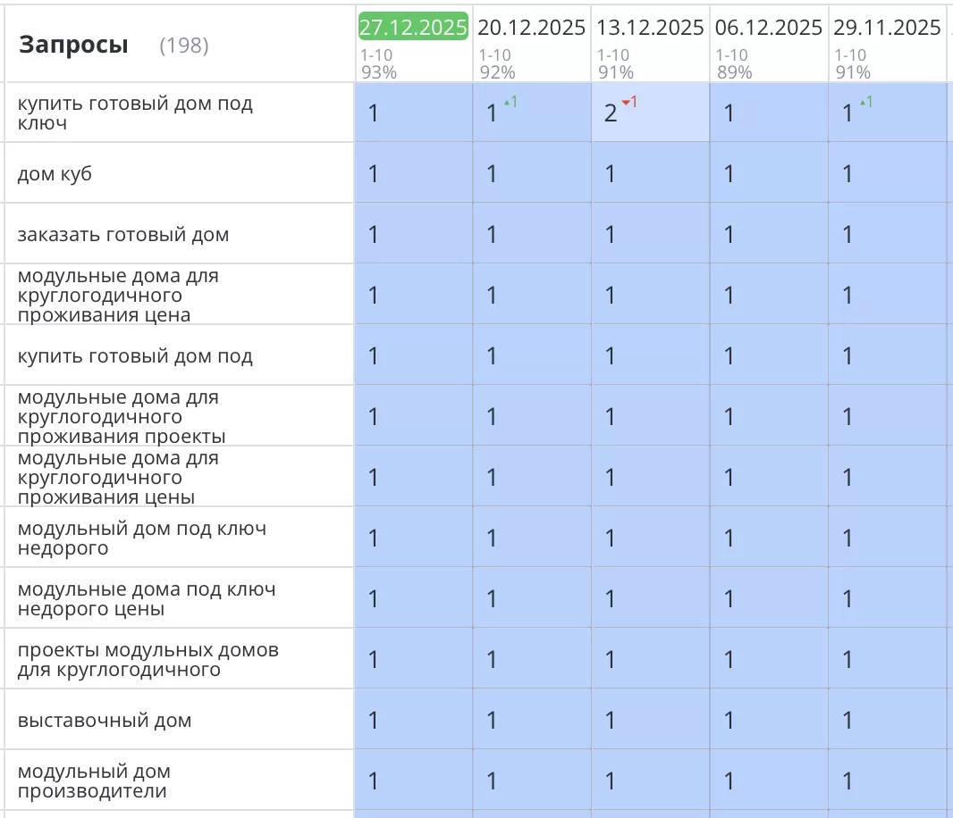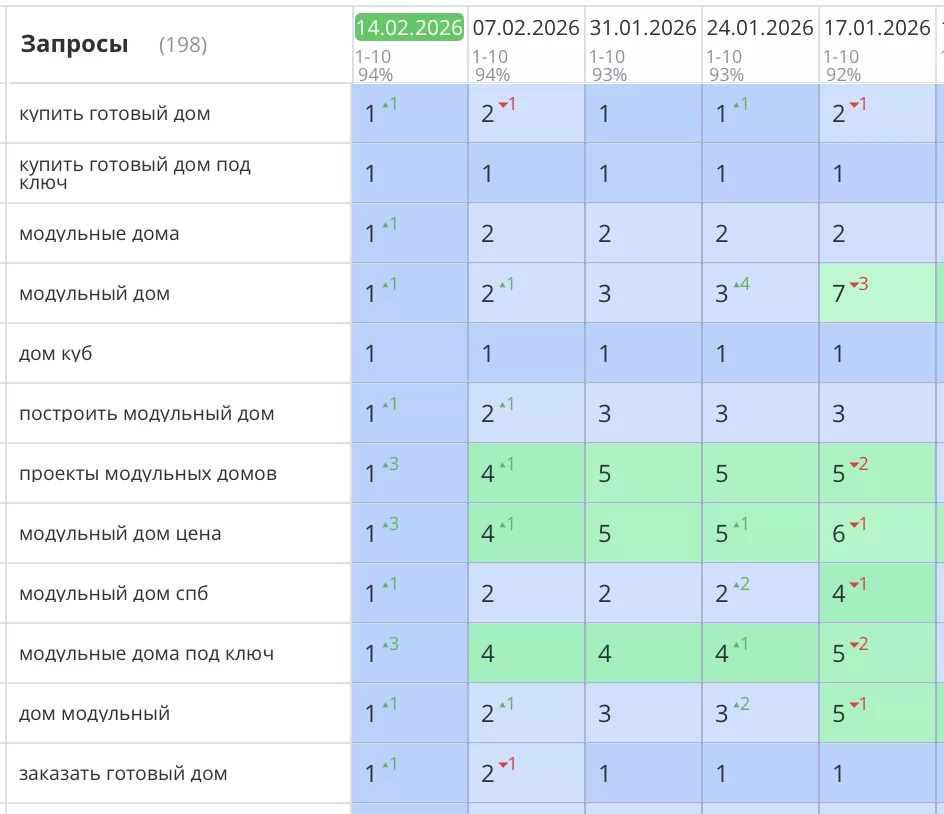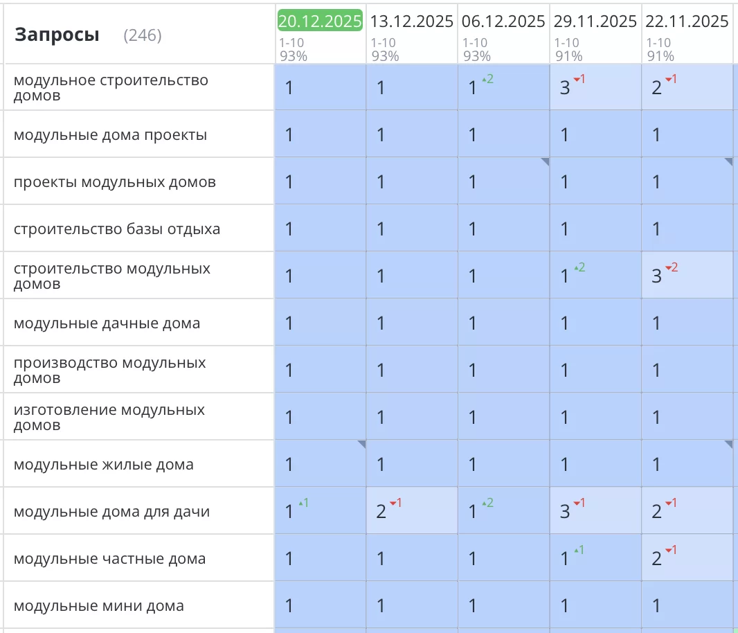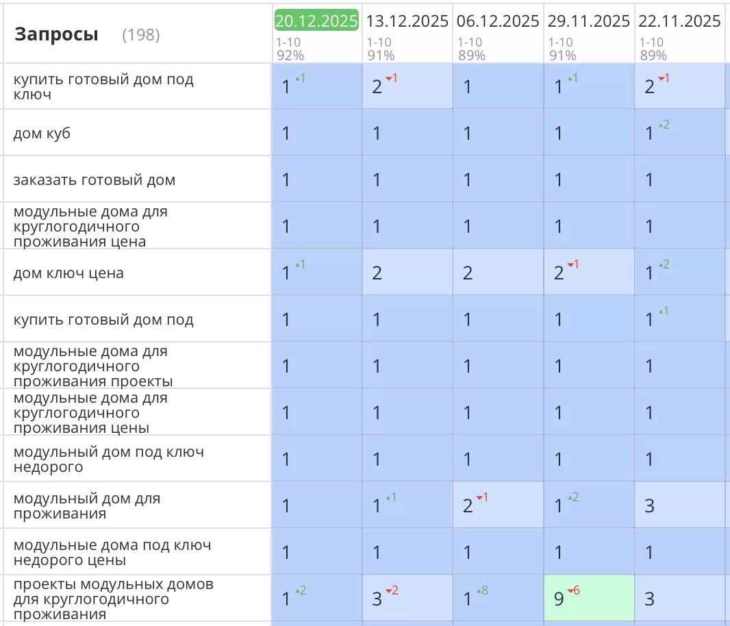Выполнено SEO продвижение сайта по строительству домов из СИП панелей в Санкт-Петербурге. Компания «ДОМ ГРУПП». Все основные запросы уверенно вышли в ТОП1 Яндекс и зафиксировались там. Увеличение целевого трафика, звонков и продаж на 57%