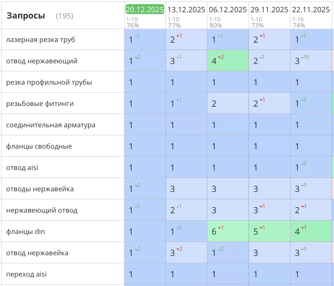 Было выполнено продвижение сайта по продаже лакокрасочных изделий и грунтовки в Санкт-Петербурге. В результате комплексного SEO подхода органический трафик на сайт начал стабильно расти. Позиции сайта по ключевым высокочастотным запросам («купить краску в спб», «грунтовка по металлу», «эмаль пф 115») вышли в топ-1, а по множеству низкочастотных запросов — в топ-3 Яндекс. Это привело к увеличению количества целевых звонков и заявок с сайта, напрямую повлияв на рост продаж компании.
