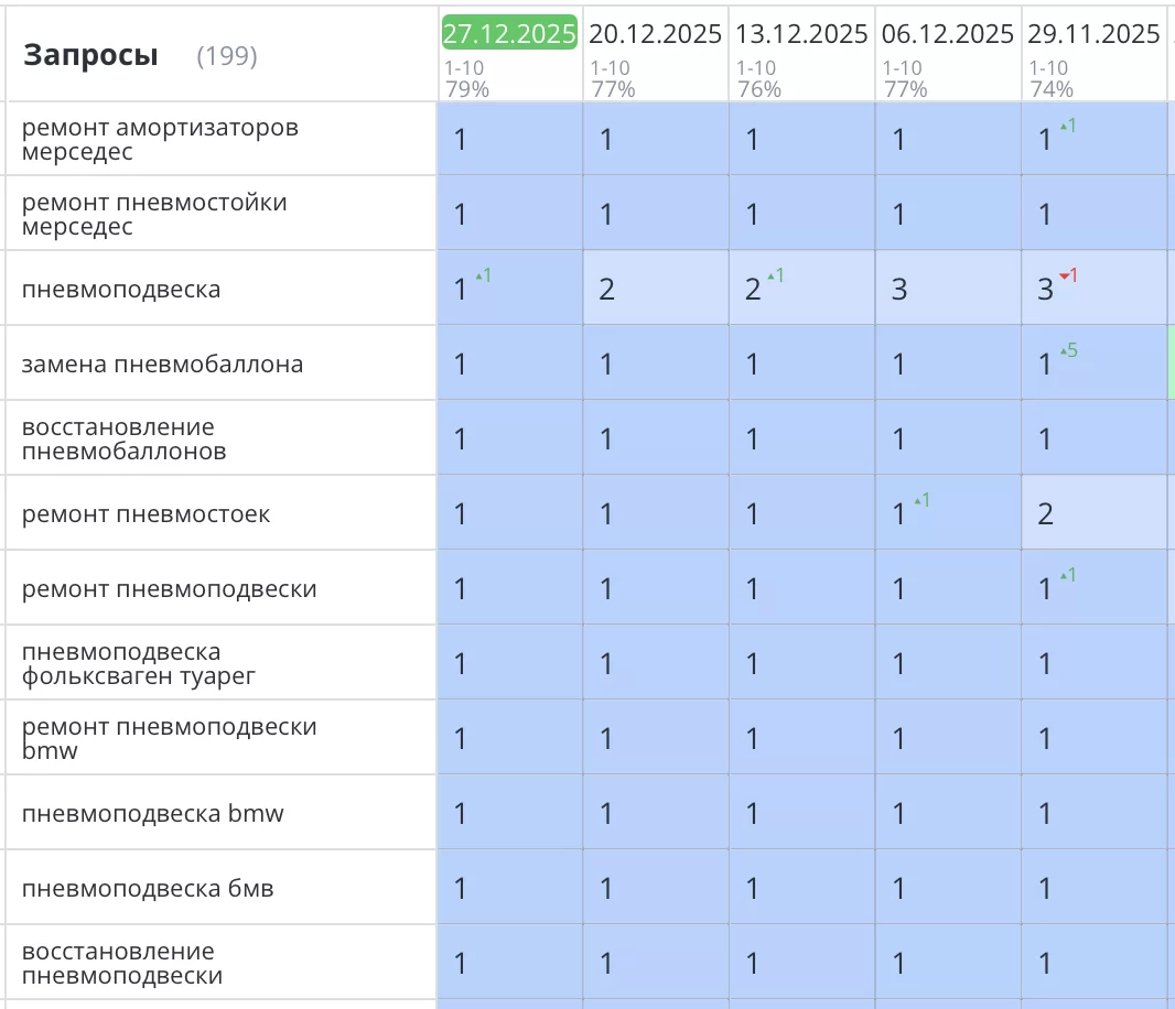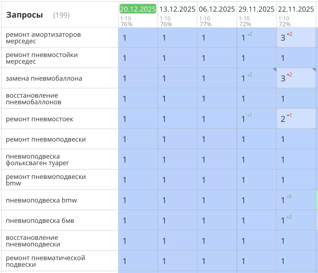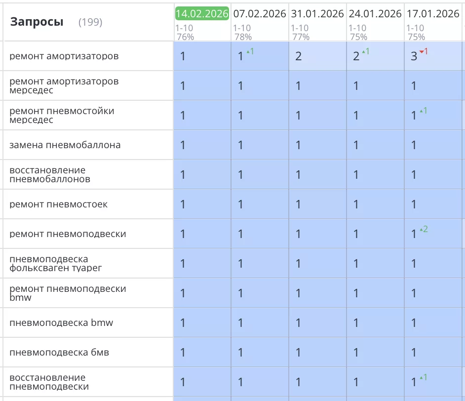 Было выполнено продвижение сайта по ремонту пневмоподвески и амортизаторов в Санкт-Петербурге для компании «RSR». Задача улучшить позиции и привлечь больше целевого трафика и продаж выполнена, что наглядно видно на скриншоте ниже, все основные позиции вышли в ТОП1 Яндекс.
