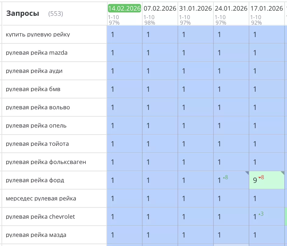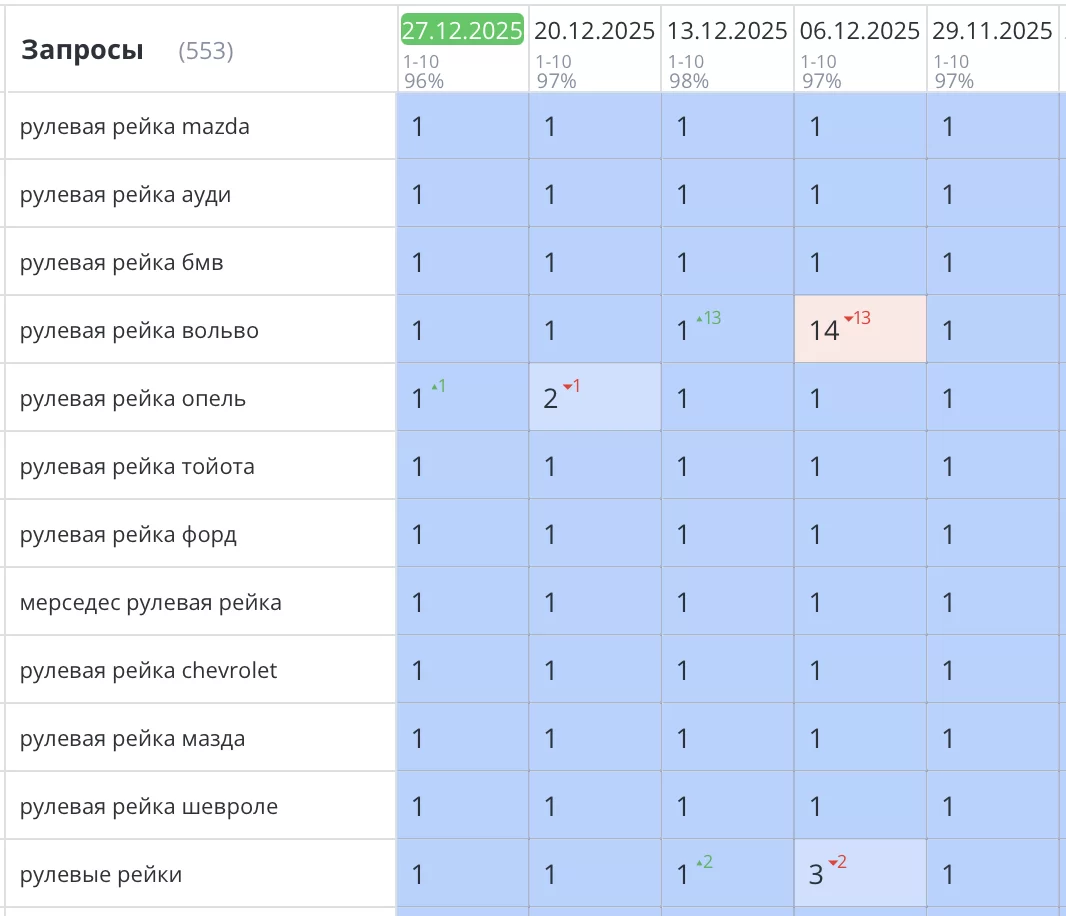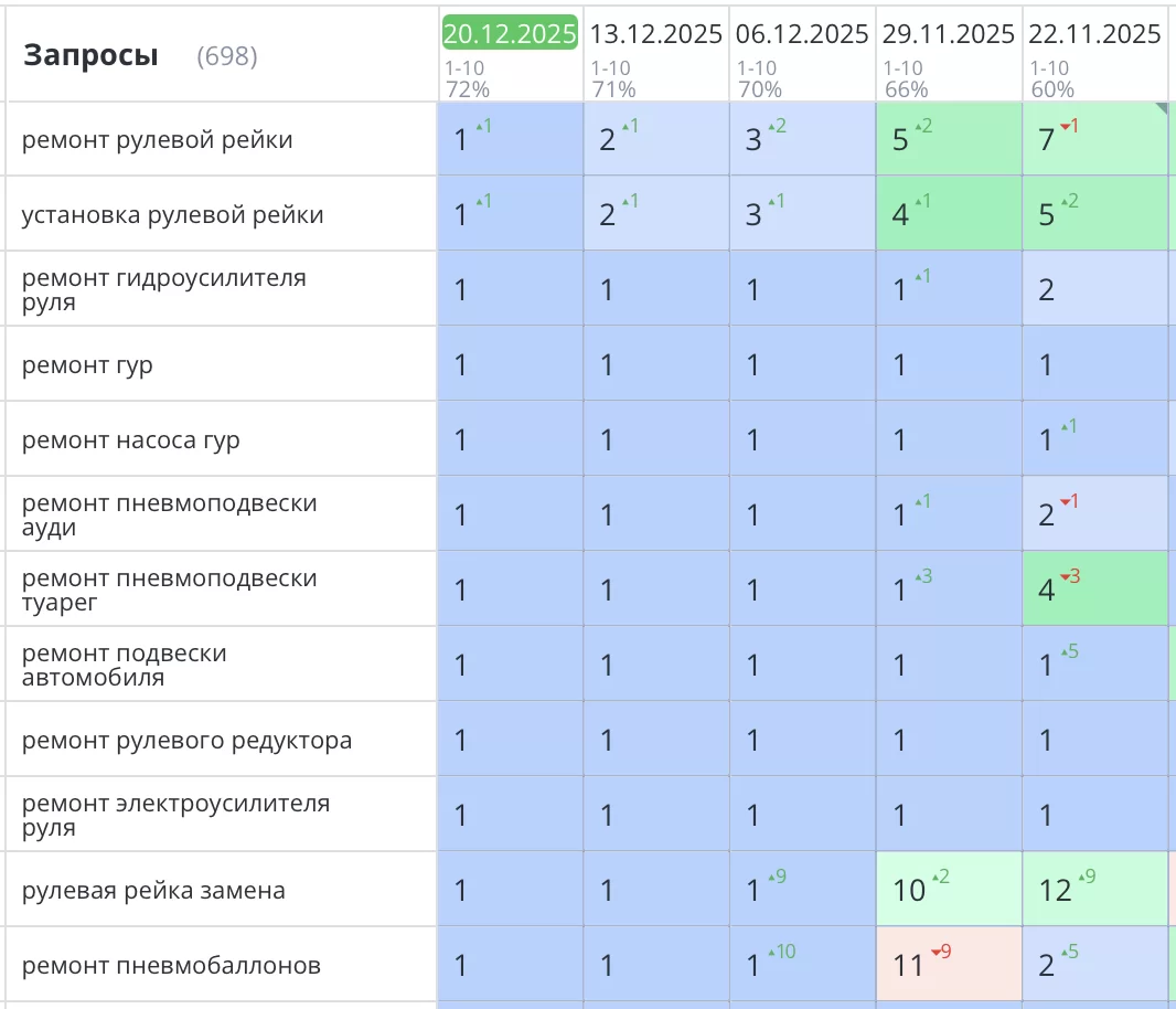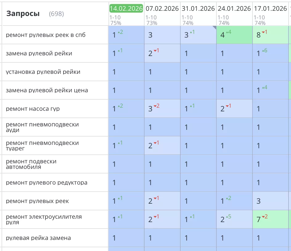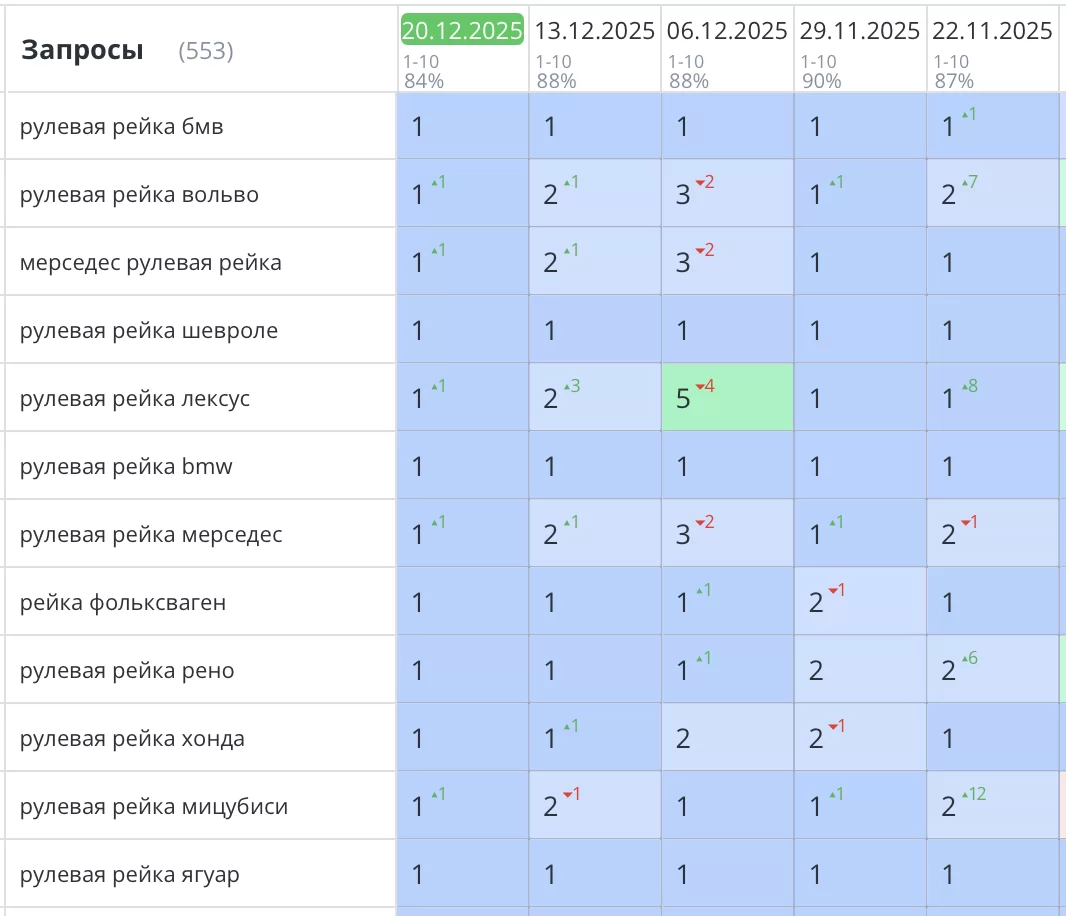 Было выполнено SEO продвижение сайта по ремонту рулевых реек в Санкт-Петербурге. Компания «RSR—РУЛЕВАЯ РЕЙКА РУ» Все основные запросы уверенно вышли в ТОП1 Яндекс и начали приводить целевых клиентов и звонки на сайт. Количество продаж увеличилось на 87%.