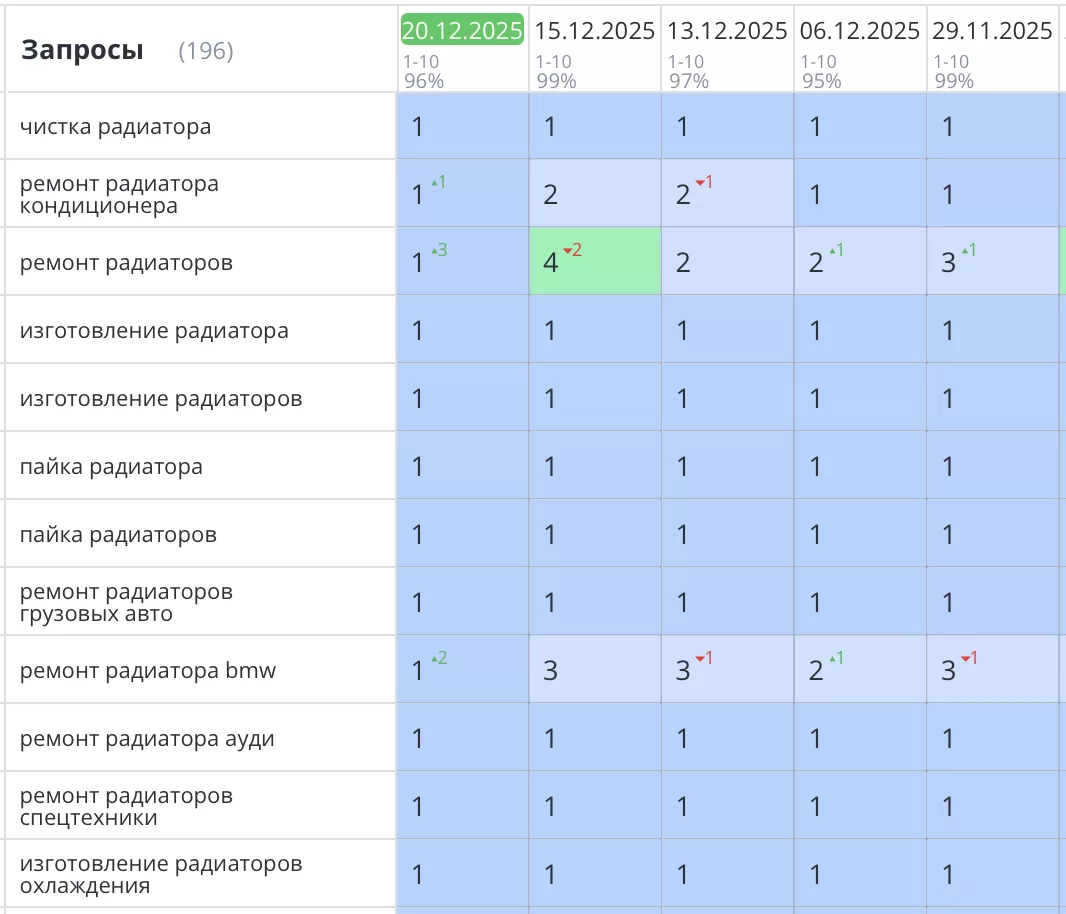 Было выполнено создание и SEO продвижение сайта по ремонту радиаторов в Москве. Компания «АВТОКОМ». Все основные продающие запросы вышли в ТОП1 Яндекс и зафиксировались там. Количество заявок и звонков увеличилось на 75%.