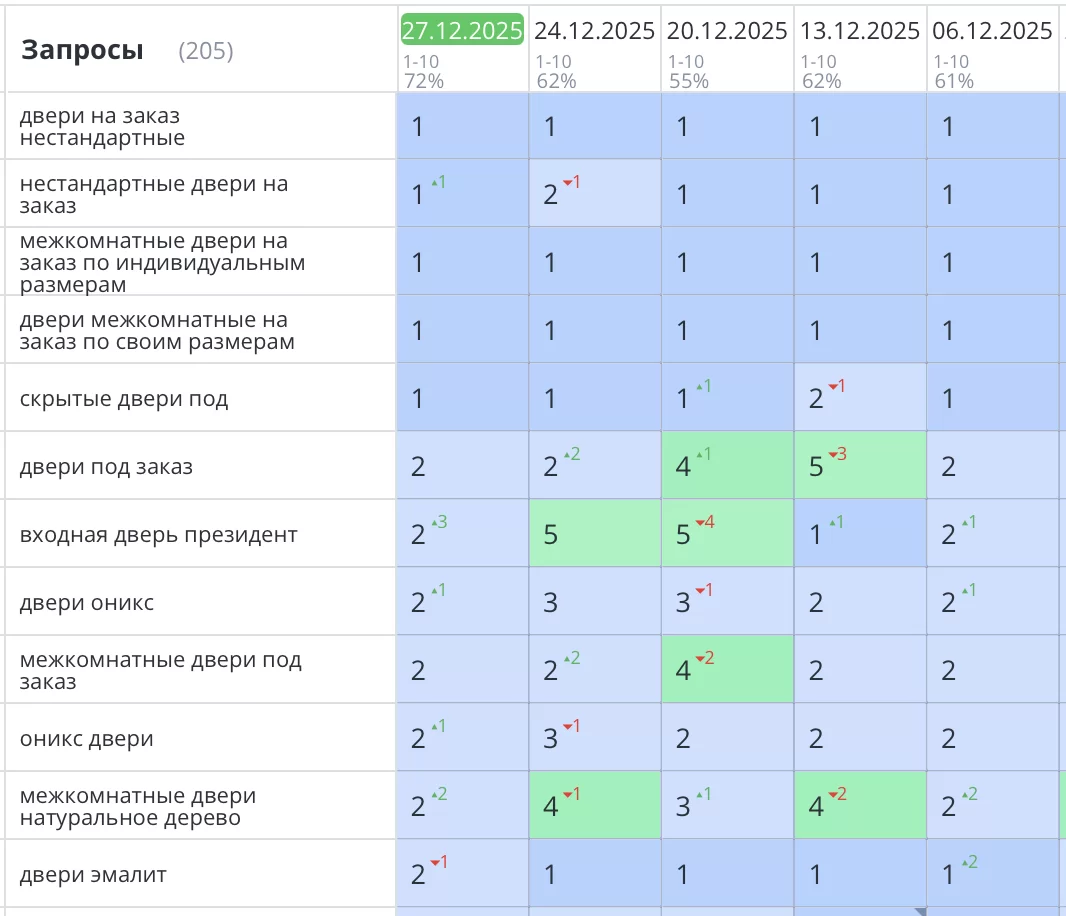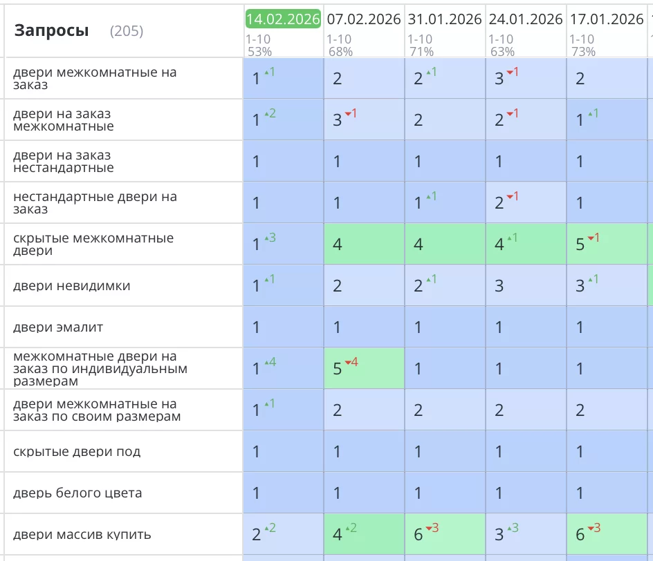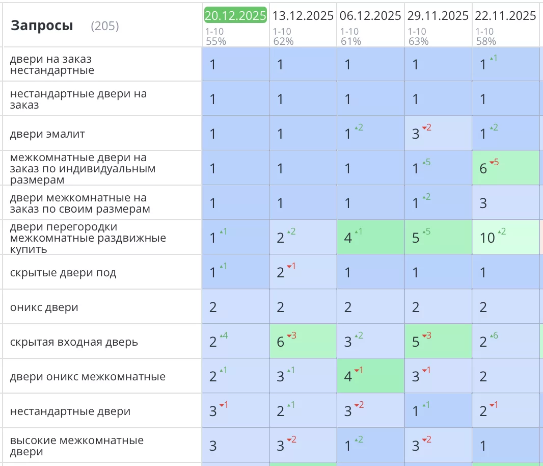 Было выполнено продвижение сайта (интернет-магазина) дверей в Калининграде. В результате грамотной технической и SEO оптимизации все основные продающие и бюджетонаполняющие запросы уверенно вышли в ТОП3 Яндекса и закрепились там. Увеличение заявок и звонков превысило 57% от начального уровня (до SEO продвижения).