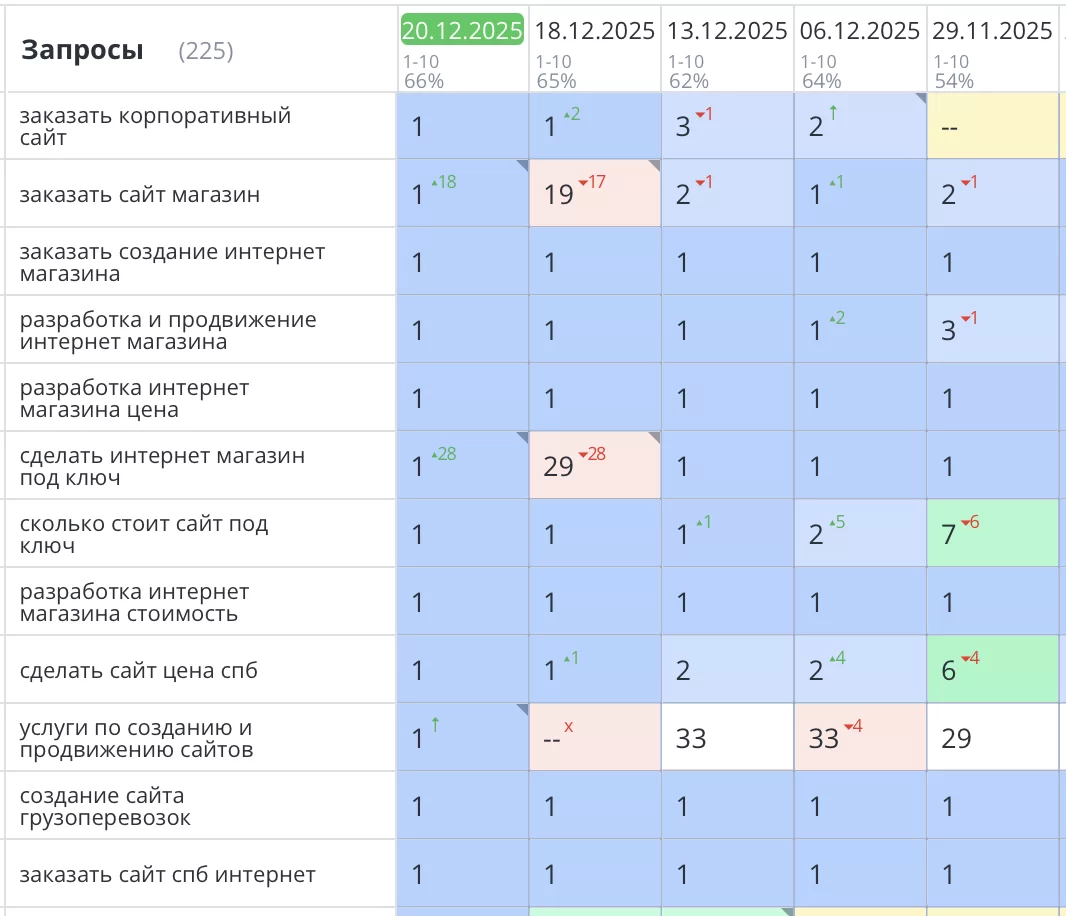 Было выполнено продвижение сайта go-up.info для компании занимающейся созданием сайтов и интернет-магазинов в Санкт-Петербурге. Все основные запросы стремительно вышли в ТОП3 Яндекс, зафиксировались там и начали приносить целевой трафик, звонки и продажи.