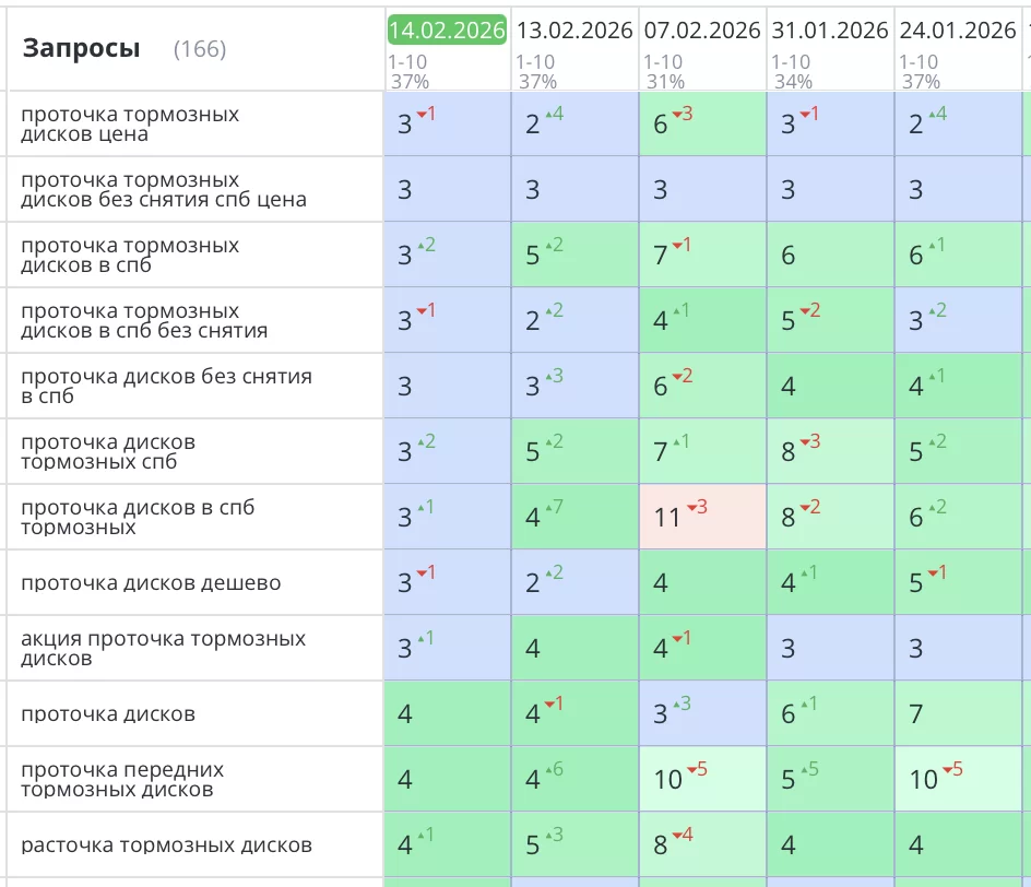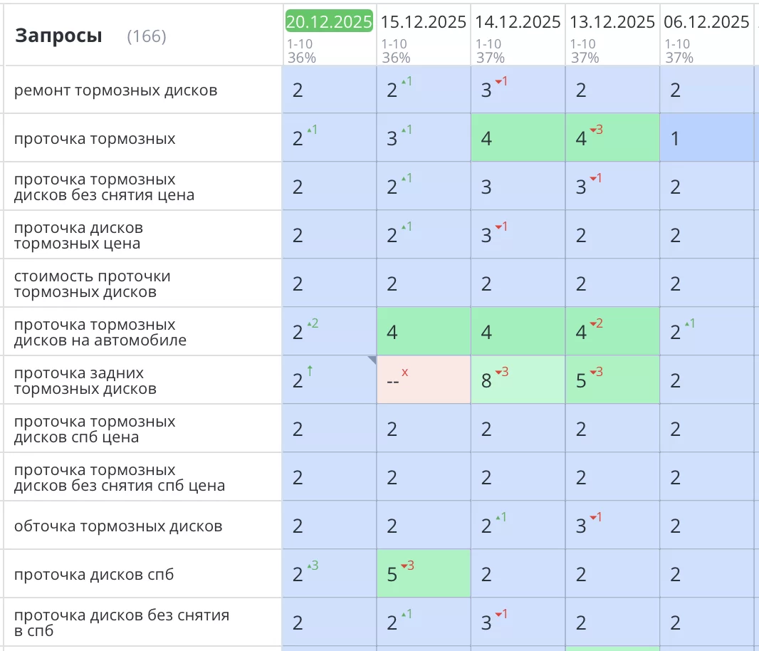 Было выполнено продвижение сайта «проточка-дисков.рф», специализирующегося на услугах проточки тормозных дисков и других авторемонтных работах. Основная цель SEO-оптимизации заключалась в повышении видимости ресурса в поисковых системах, привлечении целевого трафика и увеличении количества заявок.