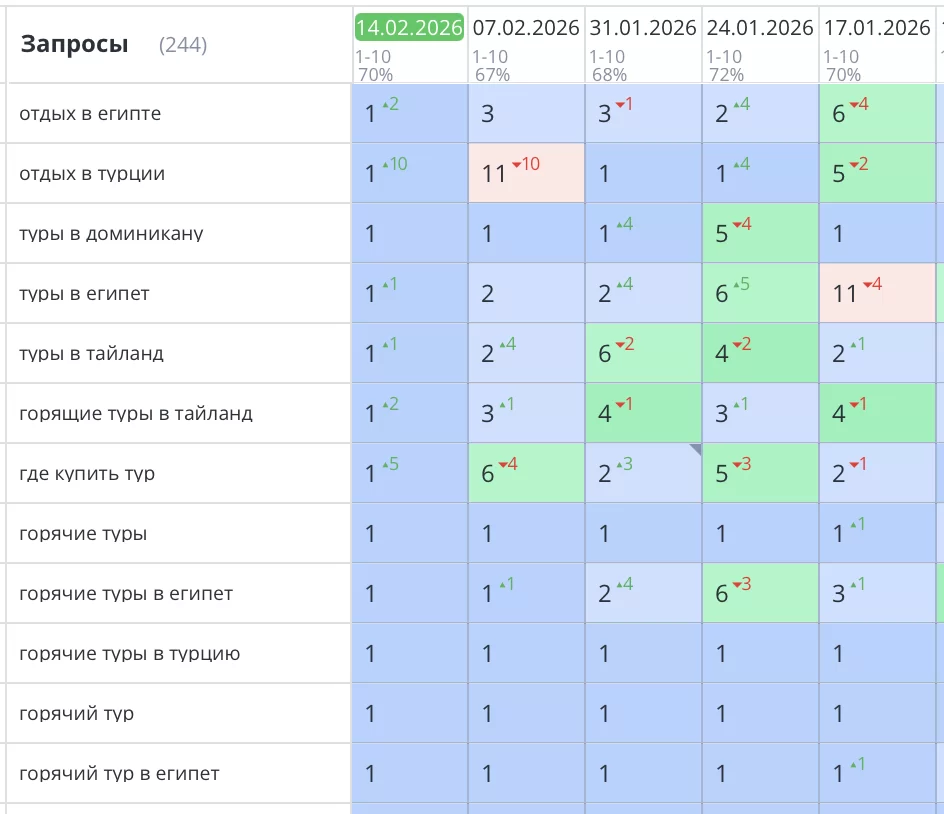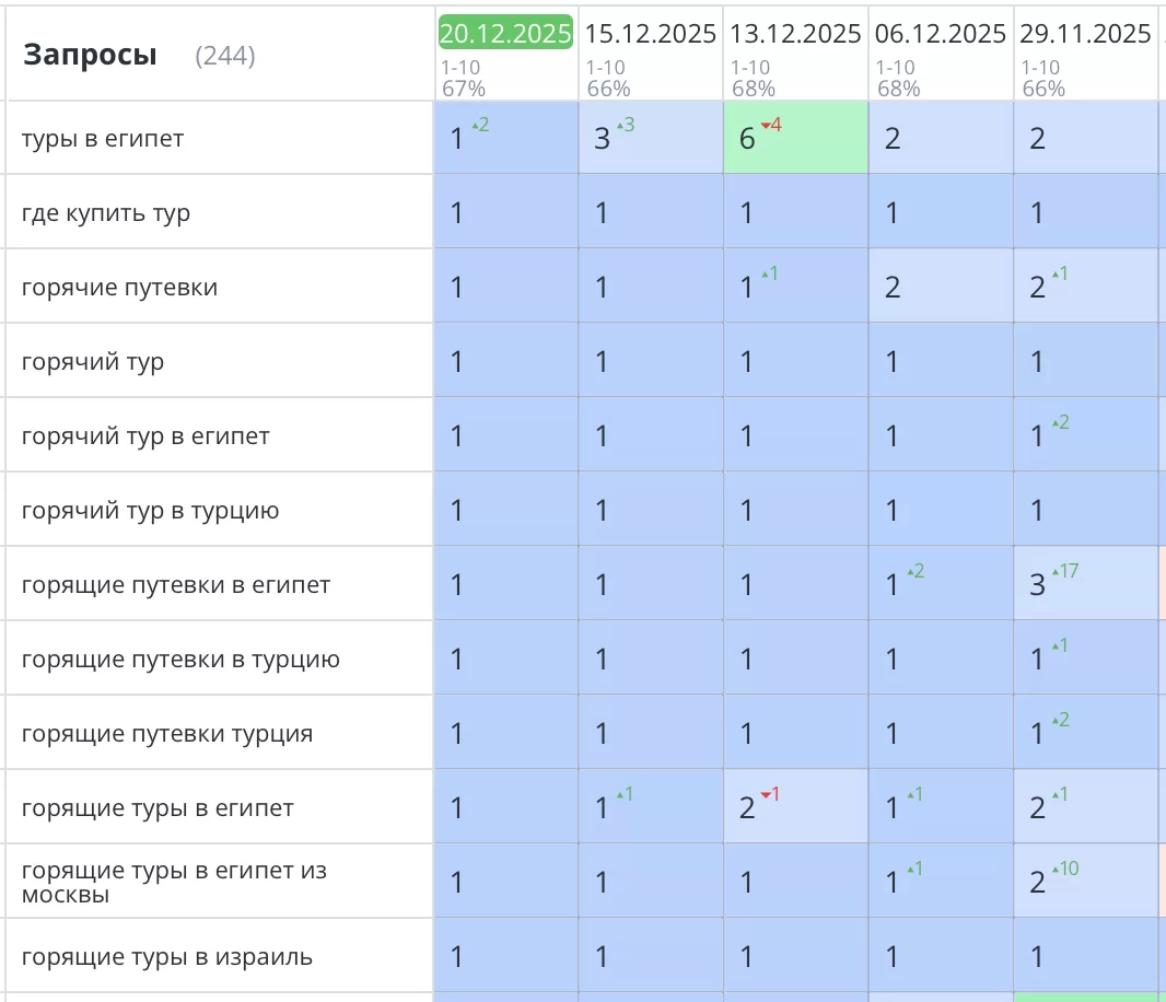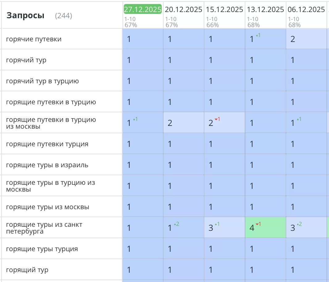 Было выполнено продвижение туристического сайта компании «сеть магазинов горящих путевок» в Москве. Все самые продающие запросы уверенно вышли и зафиксировались в ТОП3 естественной выдачи Яндекс. Количество целевого трафика, звонков и продаж увеличилось на 40%.