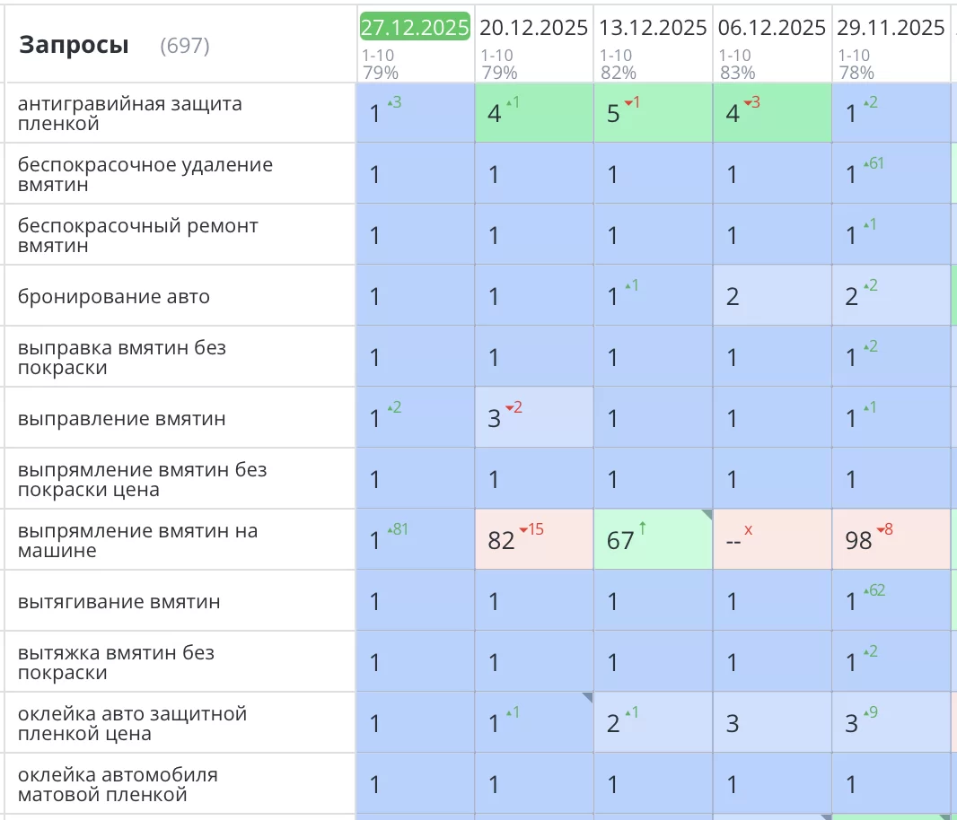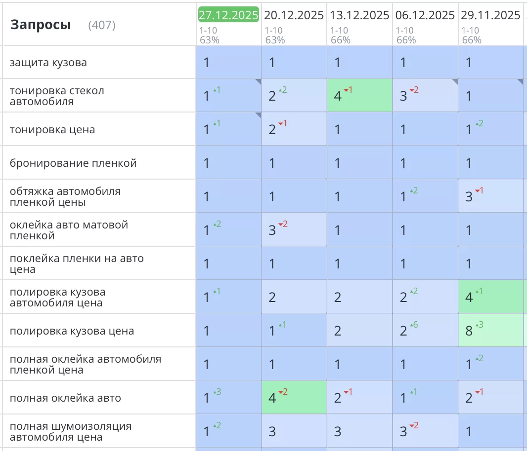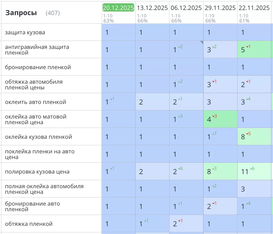 Было выполнено продвижение сайта по оклейке кузова пленкой и тонировке в Москве для компании «Детейлинг защита PRO». Сайт вышел по всем основным и продающим запросам в ТОП1 Яндекс и начал приводить целевых клиентов в компанию и продажи.