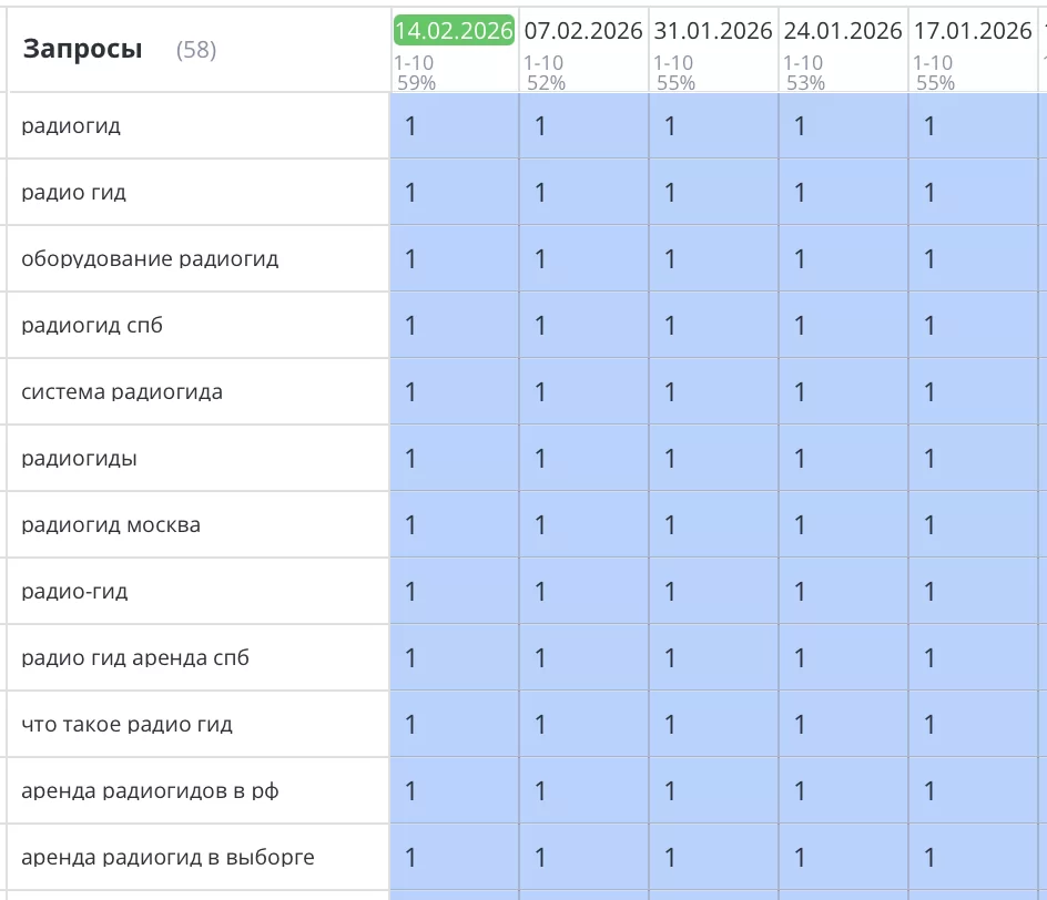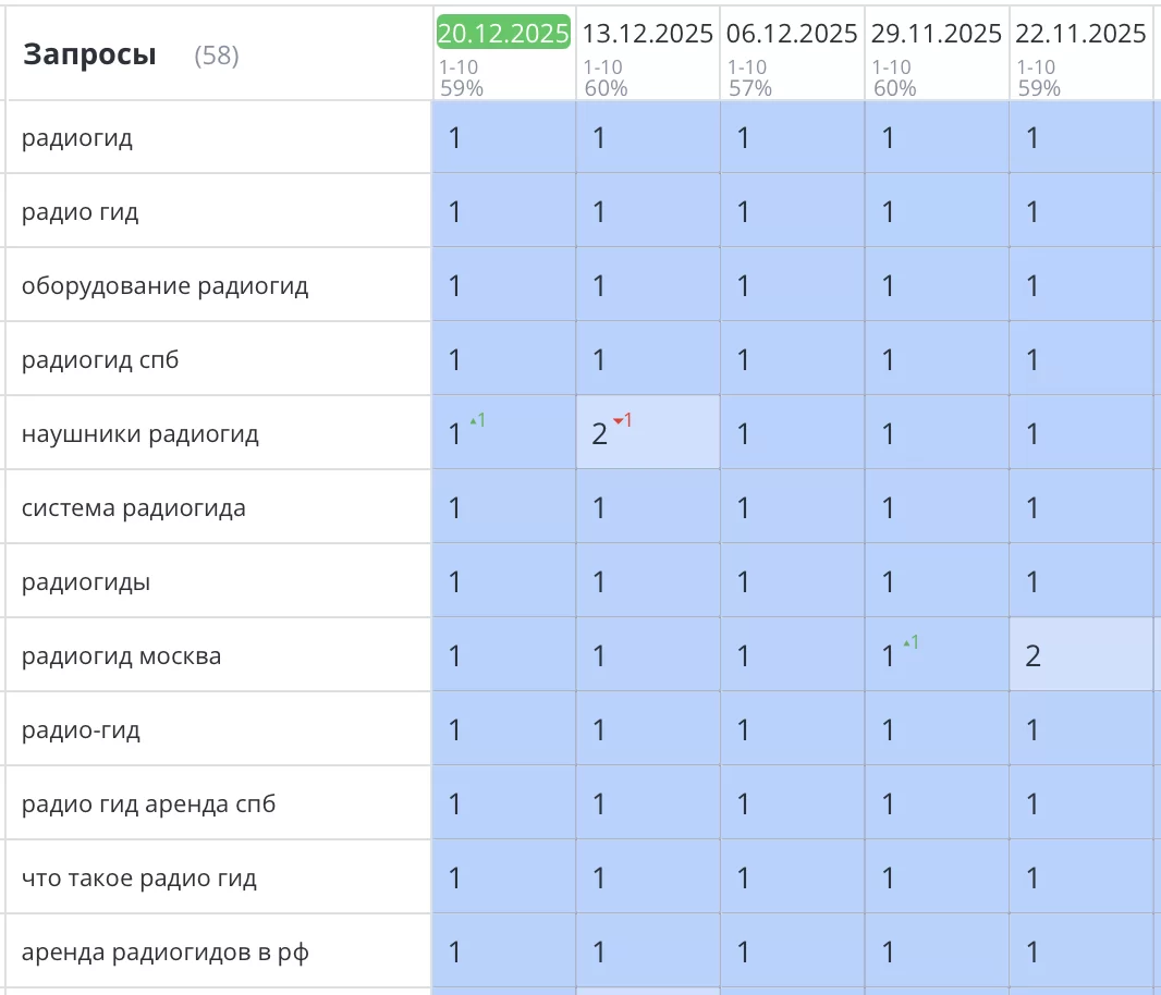 Было выполнено продвижение сайта для компании «Радиогид», которая сдает в аренду оборудование аудиогидов в СПб и по другим городам РФ. Все запросы уверенно вышли в ТОП3 Яндекс и начали приносить целевой трафик и звонки.